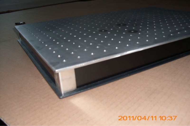 工作表面采用优质高导磁不锈钢机膜板面;粗糙度不大于0.8um,平面度不大于0.1mm/平方米,台面上的孔为铅直螺纹孔(公制M6孔,孔距为25毫米),端口为沉孔以去除毛刺,台面亚光处理。底部采用优质中碳钢蜂窝结构,隔振层面,固有频率低,隔振性能好;优质重碳隔板,性能好。表面静电喷涂:黑色外表面;
